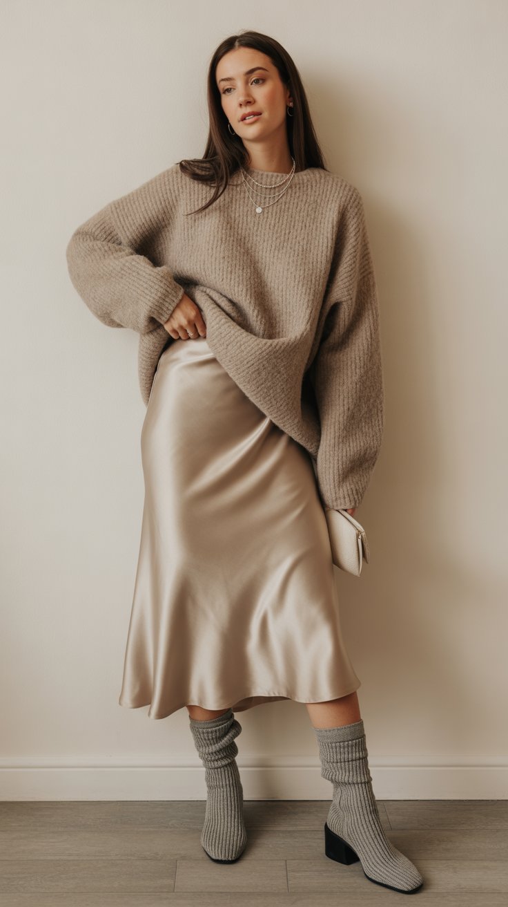 Wear this to a dinner date, a winter party, or a day at the office when you want elevated comfort. Swap satin for a pleated wool midi when it’s really freezing, and layer a thin turtleneck under the sweater for stealth warmth—trust me, it’s a game changer.