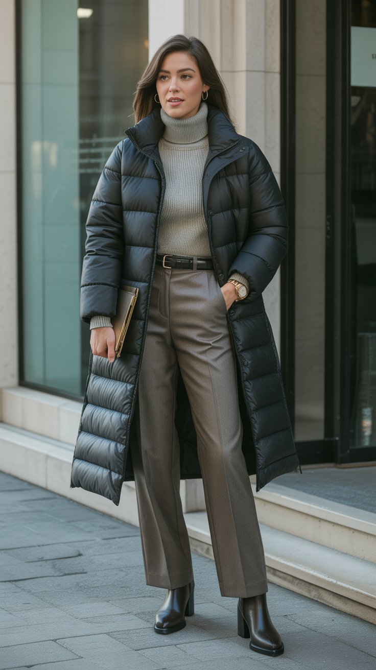 This is the “I’m warm, but I’m also put-together” look. A sleek puffer coat paired with a fitted turtleneck and structured trousers gives you insulation without the marshmallow effect. It’s commuter-proof and coffee-date approved.