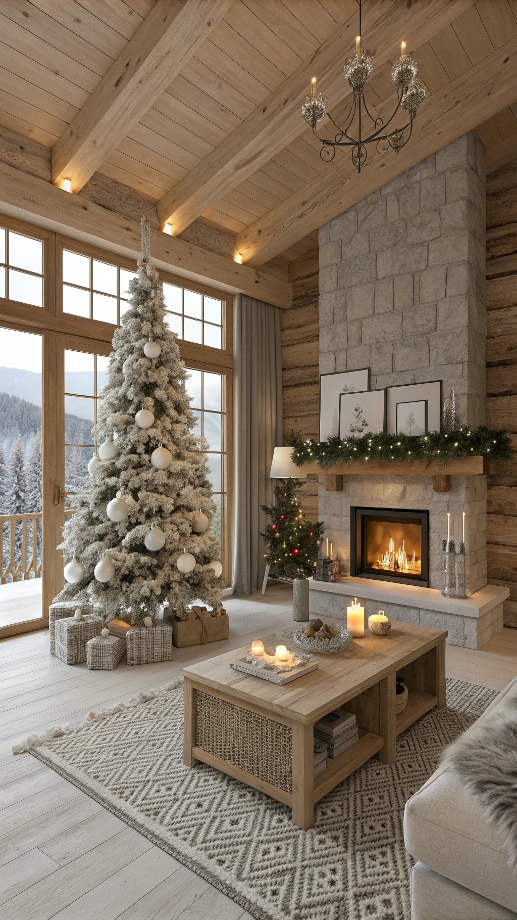 Think layered comfort: stone fireplace, shearling throws, and a light oak coffee table with a tray of pine-scented candles. A neutral diamond-woven rug ties it all together and makes the metallic accents pop.