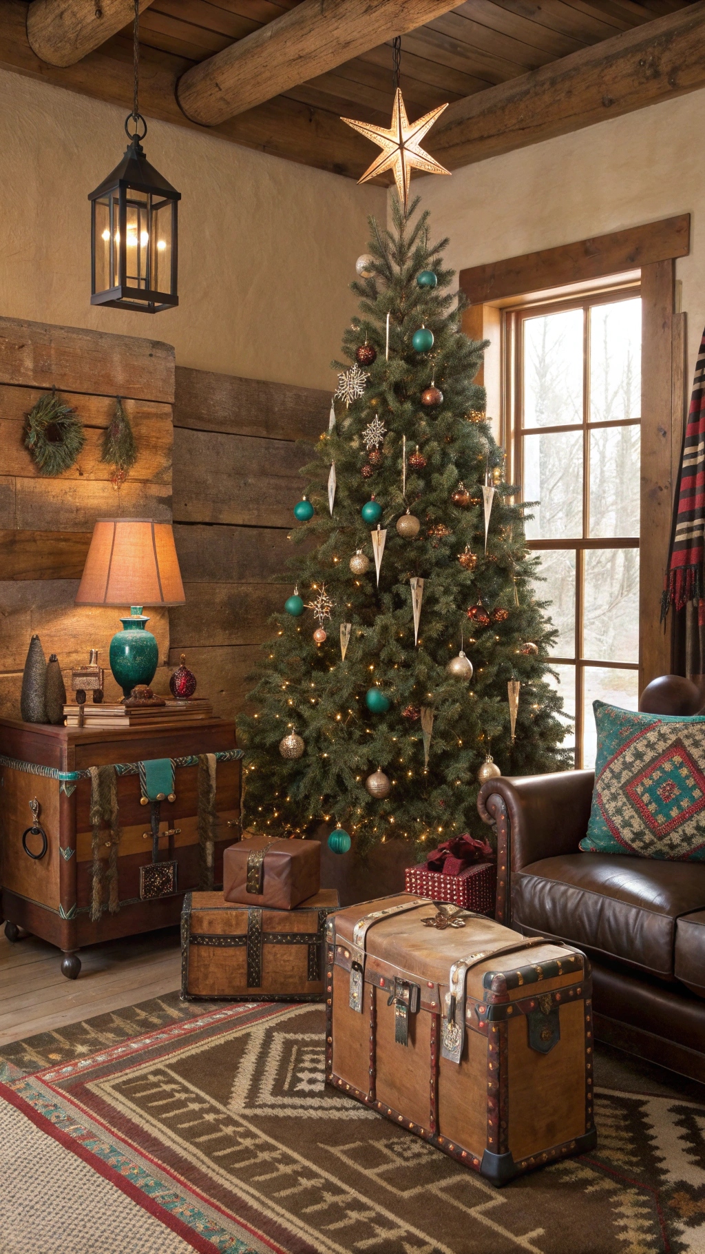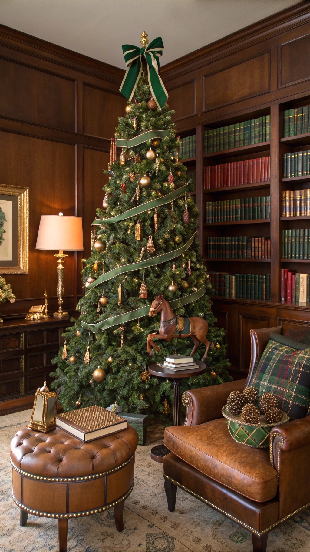 - Finishing touch: horse blanket–style tree skirt in green and tan