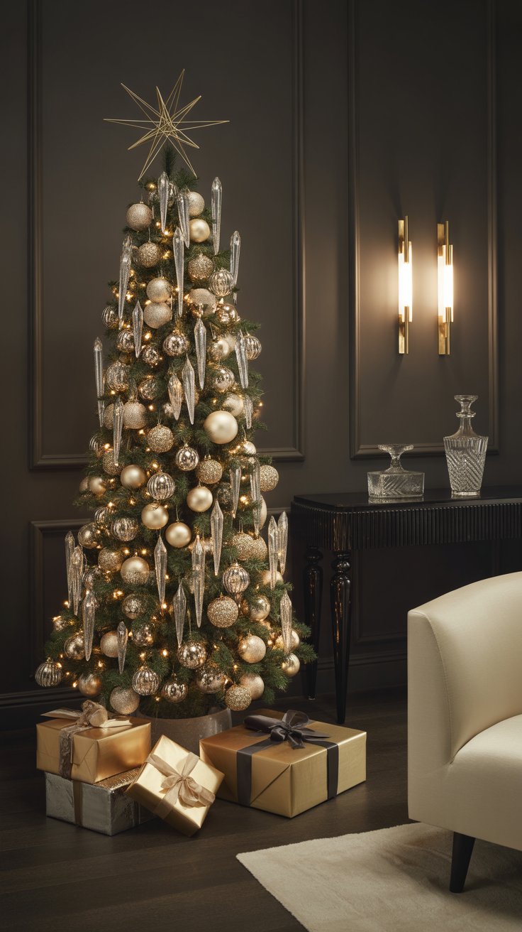 Think winter gala—sleek, sparkling, and utterly elegant. Start with a slim, tall tree and layer clear glass icicles, smoked mirror ornaments, and champagne-tinted baubles. Wrap the trunk in black velvet ribbon for subtle drama.