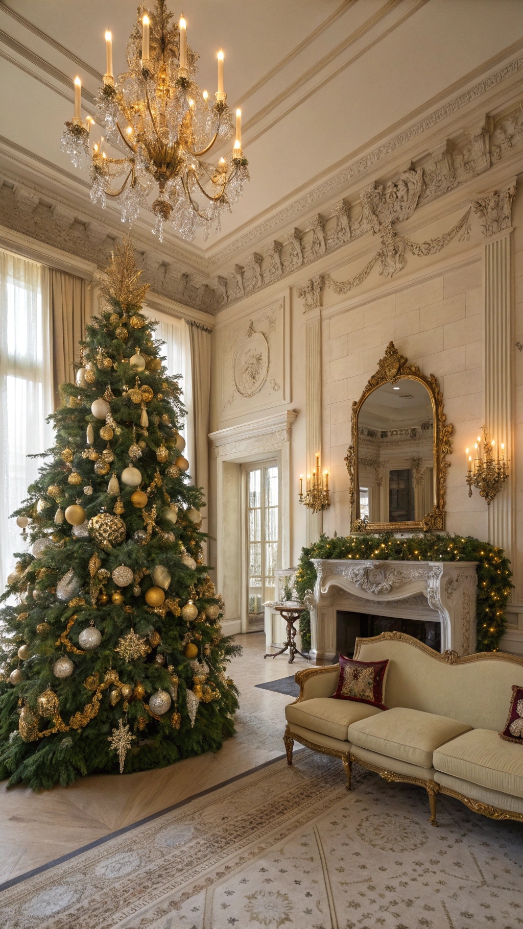 Surround it with lacquered side tables, a tailored cream sofa, and a piano-black console topped with crystal decanters. Lighting is everything: dimmers low, warm white micro-lights on the tree, and a pair of brass sconces flickering in the background.