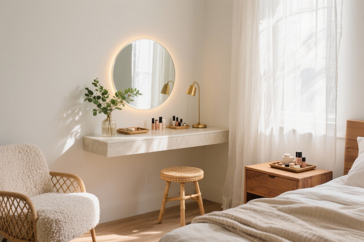 Keep the palette soothing—warm white walls, light oak, and a whisper of linen beige. A petite upholstered stool tucks underneath, and a single slender brass sconce balances the look. Use a narrow acrylic tray for essentials and a tiny bud vase for softness.