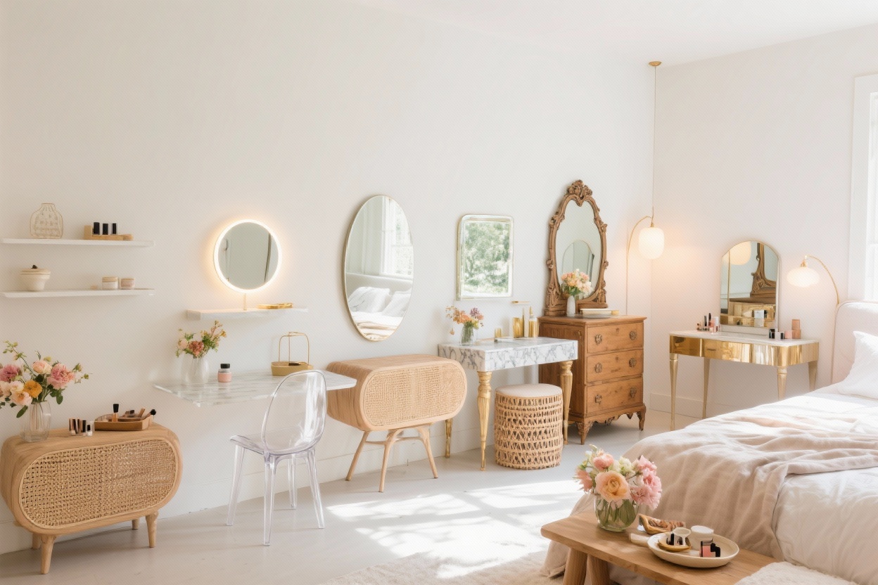 Channel red-carpet glam without going kitschy. Start with a curvy antique-style vanity table in glossy black or deep walnut, paired with a tufted bouclé stool. The backdrop? A large panel of antiqued mirror tiles that instantly doubles the drama.