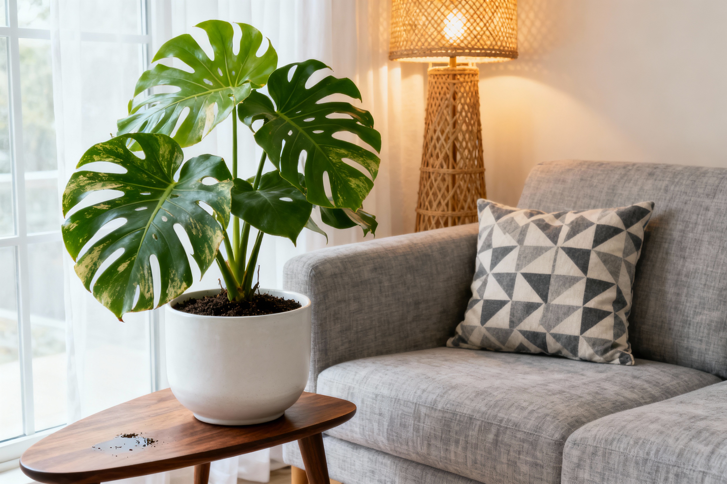 - Layer heights: Pair your Monstera with a low coffee table and a tall floor lamp for visual rhythm.