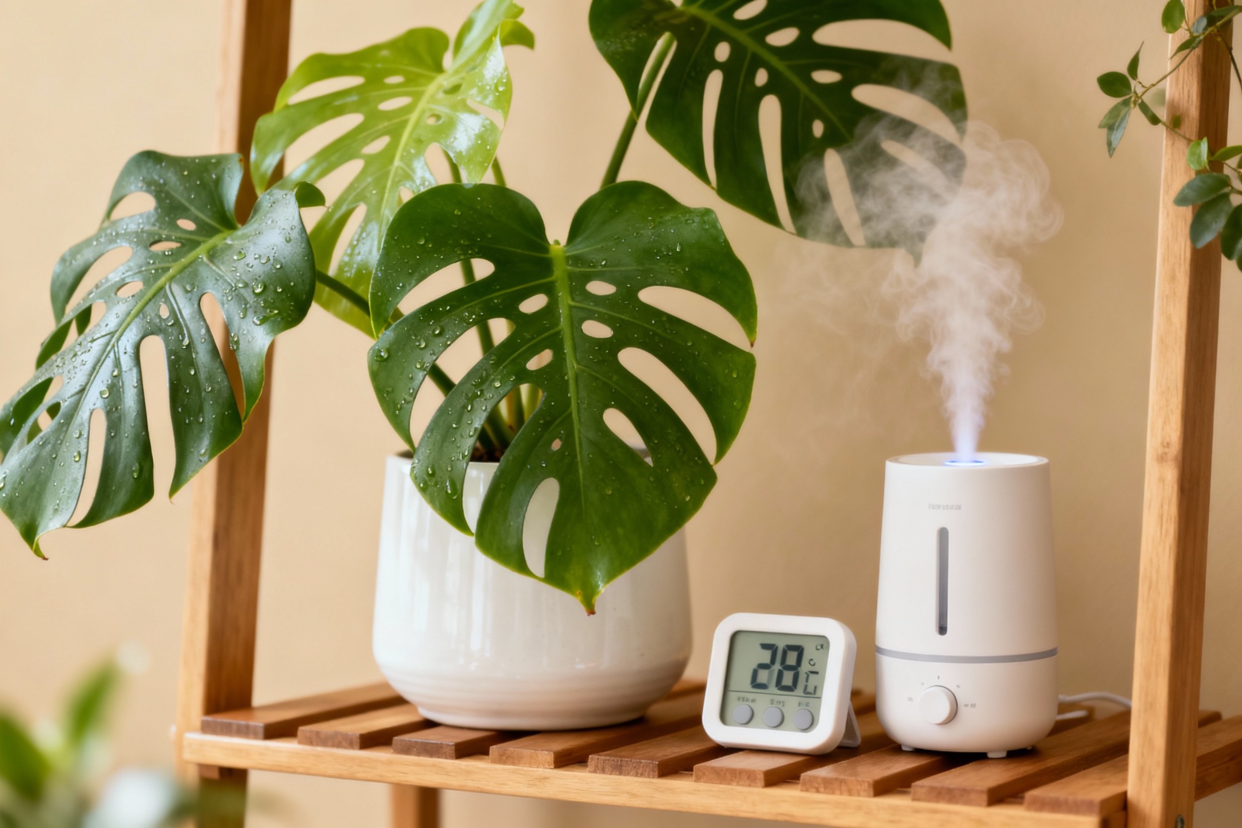 Monsteras enjoy humidity between 50–65%. They won’t cry if it dips to 40%, but they’ll pout—think brown crispy edges and slower growth.
